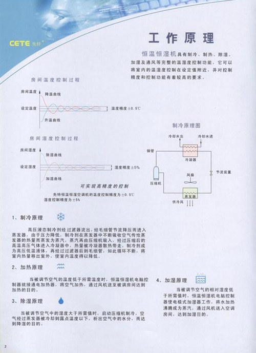 3.除湿原理:当被调节空气中的湿度大于所需值时,启动压缩机制冷,空气经过蒸发器被冷却到露点温度以下,析出空气中的水分,而达到降湿的目的.