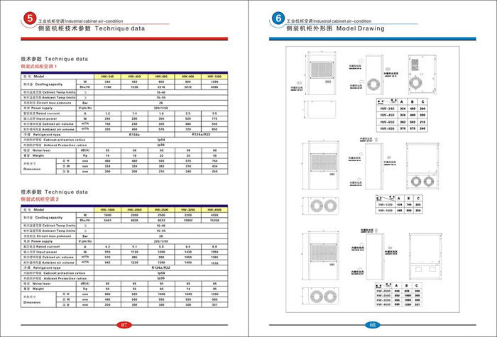 1.产品概述 电控箱空调主要用来调节电控箱内的温度与湿度,以提高箱内电气元件和其他控制元件的可靠性和使用寿命,减少电控系统因高温、潮湿或灰尘等原因造成的故障,确保电气控制系统安全运行。 2.适用范围 *各类C NC设备的电控箱 *通讯、通信设备 *程序控制交换机 *大型机械操作控制箱 *各类电加工机械控制箱 3.产品功能与特点 *超薄的外观设计,安装维护方便,集美观和实用于一体; *采用微电脑全自动程控,控制精确,运行状态一日了然,用户可根据需要自行设定温度; *实现了电控箱内部空气与外部空气完全隔离,有效防止外部灰尘和潮湿的空气进行电控箱内; *调节电控箱内温和湿度并使之保持在设定的状态,提高电控系统的可靠性,延长电子元件的使用寿命,减少故障的发生; *具有多重保护功能:安全保护功能,压缩机内部过热保护,冷凝高温保护等.