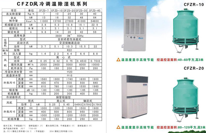 本公司生产的风冷调温型除湿机除湿量从6KG/H到30KG/H,具有降温除湿,调温除湿,升温除湿功能,导风形式可分为前出风,上出风,管道送风几种形式